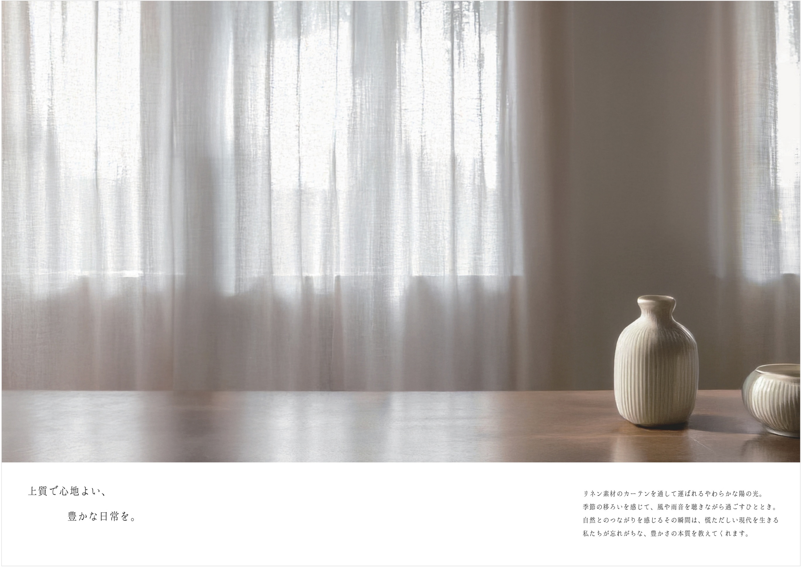 natsusobikuの麻のカーテンをお部屋に取り入れた際のイメージを、これまで以上にお客様に感じて頂けるカタログとなっていると思います。