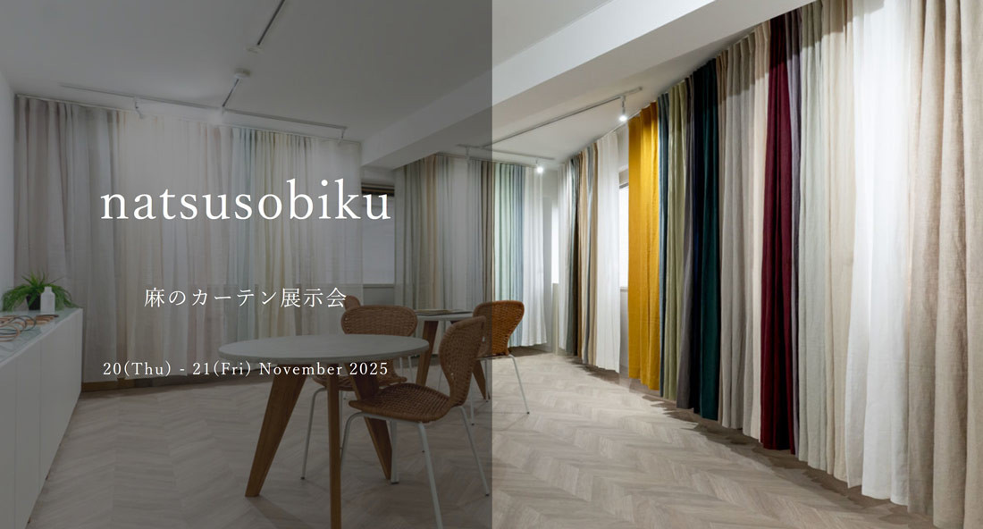 この度、「 natsusobiku 東京ショールーム 」にて、麻のカーテン展示会 を開催いたします。